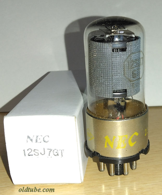 1AJ4(=DF96) =filamentary RF Pentode= (EIA/7DP - miniature) Ef/If=1.4V/0.025A Ppmax=0.25W Epmax=90V Pc2max=0.1W Ec2max=90V Ikmax=2.2mA Rg1max=3MΩ op: Ep=64V Rg2=0Ω Ec2=64V Ec1=0V Ip=1.65mA Ic2=0.55mA rp=1.0MΩ gm=0.75mS op: Ep=85V Rg2=39kΩ Ec2=64V Ec1=0V Ip=1.65mA Ic2=0.55mA rp=0.7MΩ gm=0.75mS pins: 1(G3,F-,IS)-2(P)-3(G2)-4(NC)-5(G3,F-,IS)-6(G1)-7(F+) 4) 1AJ4/DF96 Matsushita ¥500 lightly-used WB