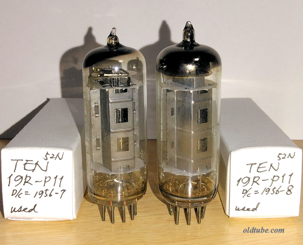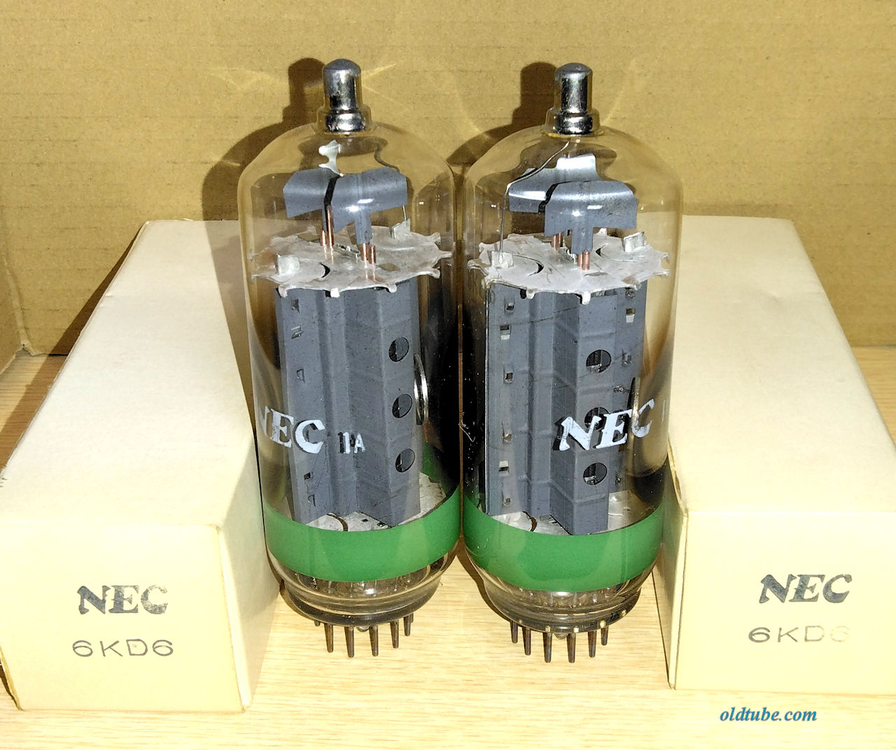コンパクトロン半波整流管のピン・コンパチビリティ・・・etc EIA/12BL, 12FX, 12GA, 12GK, 12HFベースのコンパクトロン形状のダンパー/半波整流管では、ソケットで "IC"ピンや"NC"ピンは不慮の放電等のリスクを避けるため、中継ピンなどには他用しません。そして、 『ピン1(H), 4(P), 7(K), 10(P), 12(H)のみを用いれば、全て実質・同一ピン配列/ピン・コンパチブル』に なります。ただし当然ながらヒーター、最大プレート損失、最大DC出力電流などの規格値は球毎に異なります。 *(EIA/12BL - compactron) pins : 1(H)-2(NC)-3(NC)-4(P)-5(NC)-6(NC)-7(K)-8(NC)-9(NC)-10(P)-11(NC)-12(H) "6AX3" (6.3V/1.2A, 5.3W, 160mAdc) "6BJ3" (6.3V/1.2A, 4W, 140mAdc) *(EIA/12FX - compactron) pins : 1(H)-2(NC)-3(NC)-4(P)-5(IC)-6(IC)-7(K)-8(IC)-9(IC)-10(P)-11(NC)-12(H) "6BW3" (6.3V/1.6A, 6.5W, 175mAdc) "6BZ3" (6.3V/1.2A, 6.5W, 200mAdc) "6CD3" (6.3V/2.5A, 12W, 350mAdc) *(EIA/12GA - compactron) pins : 1(H)-2(NC)-3(NC)-4(P)-5(IC)-6(NC)-7(K)-8(NC)-9(IC)-10(P)-11(NC)-12(H) "6BE3" (6.3V/1.2A, 6.5W, 200mAdc) "6BE3/6BZ3" (6.3V/1.2A, 6.5W, 200mAdc) *(EIA/12GK - compactron) pins : 1(H)-2(IC)-3(IC)-4(P)-5(IC)-6(IC)-7(K)-8(IC)-9(IC)-10(P)-11(IC)-12(H) "6CE3" (6.3V/2.5A, 11W, 350mAdc) "6CE3/6CD3/6DT3" (6.3V/2.5A, 11W, 350mAdc) *(EIA/12HF - compactron) pins : 1(H)-2(IC)-3(NC)-4(P)-5(IC)-6(IC)-7(K)-8(IC)-9(IC)-10(P)-11(NC)-12(H) "6CG3" (6.3V/1.8A, 6.5W, 350mAdc) "6DQ3" (6.3V/1.8A, 9W, 400mAdc) "6DT3" (6.3V/2.4A, 9W, 350mAdc) "6CG3/6BW3/6DQ3" (6.3V/1.8A, 6.5W. 350mAdc) "6CG3/6CD3"