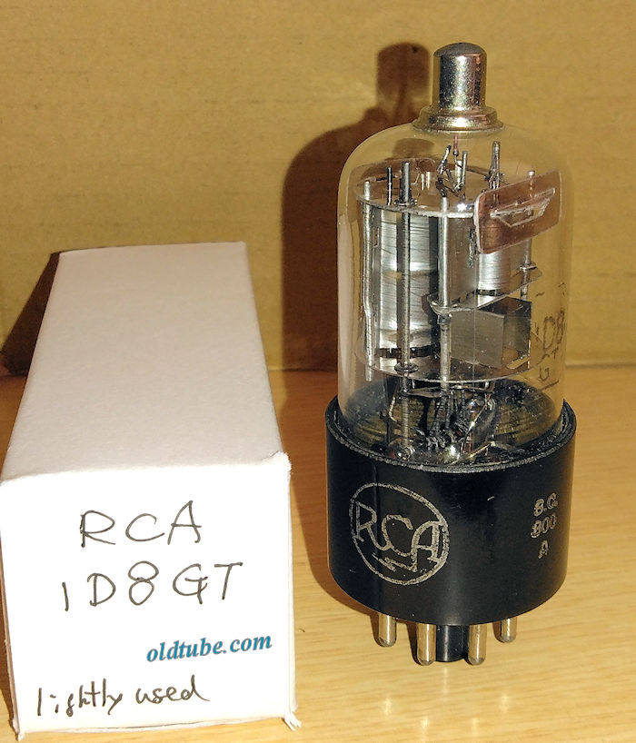 1D8GT =Diode Triode Power-Pentode= (EIA/8AJ - T9) Ef/If=1.4VDC/0.1A Triode: Epmax=110V μ=25 rp=43.5kΩ gm=0.575mS Pentode: Epmax=110V Ec2max=110V Ikmax=6mA op (P) : Ep=Ec2=90V Ec1=-9V Ip=5mA Ic2=1mA Zl=12kΩ Po=0.20W D=10% 8) 1D8GT RCA ¥1200 NIB MB WB(Nn) 1) 1D8-GT RCA ¥900 lightly-used WB