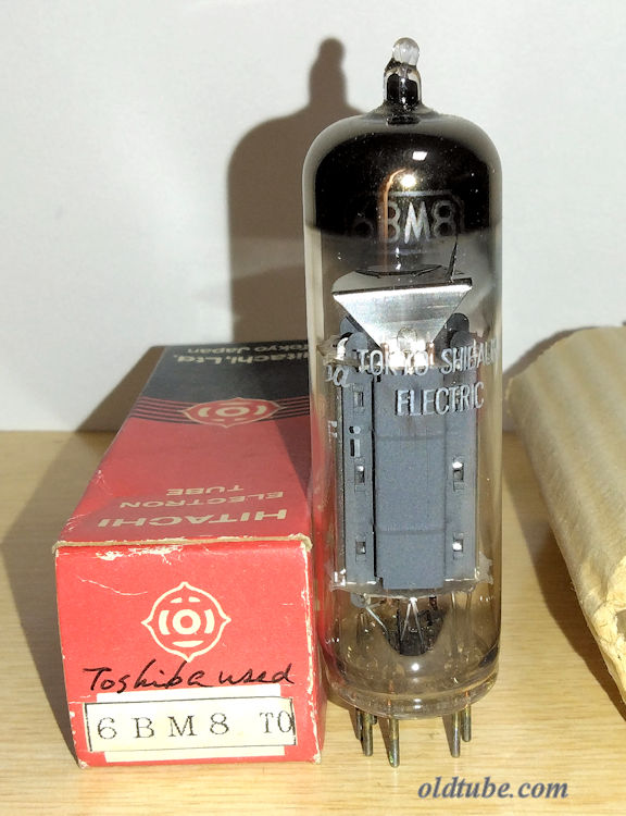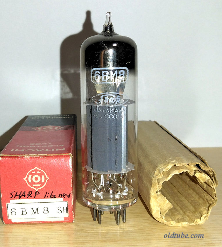 UCL82 =hi-mu-Triode power-Pentode= (EIA/9EX - noval) Eh/Ih=50V/0.1A Ehkmax=±200V Pentode: Ppmax=7W Epmax=250V Pc2max=1.8W Ec2max=250V Ikmax=50mA Rg1max=1MΩ(fixed)/2MΩ(self) op : Ep=170V Ec2=170V Ec1=-11.5V Ip=41mA Ic2=9mA rp=16kΩ gm=7.5mS μg2g1=9.5 op(A1S): Ep=200V Ec2=200V Rg2=470Ω Rk=330Ω Ip=35mA/37mA Ic2=7.8mA/13.3mA Zl=4.5kΩ Po=3.3W D=10% op(AB1pp): Ep=170V Ec2=170V Rk=125Ω Ip=35mAx2/39.5mAx2 Ic2=8.5mAx2/13mAx2 Zlpp=4.5kΩ Po=7W D=3.6% Triode: Ppmax=1W Epmax=250V Ikmax=15mA Rg1max=1MΩ(fixed)/3MΩ(self) op: Ep=100V Ec=0V Ip=3.5mA rp=32kΩ gm=2.2mS μ=70 UCL82 = 50BM8 heater variants : 6BM8(6.3V/0.78A), 8B8(8V/0.6A), 11BM8(10.7V/0.45A), 16A8(16V/0.3A), PCL82(16V/0.3A), 32A8(32V/0.15A) also see : Schematic - 50BM8 single-ended PTL stereo amp. - by Haruo Matsushita / 松下春雄,- Pout=3W+3W, - on July 25, 1966, extra issue of Radio Basics(最新ステレオHiFi製作読本), Seibundoh Shinkoh-sha, Japan. 2) UCL82 TFK ¥3300 NIB <> on bottom 8) UCL82 TFK ¥3300 NIB <> on bottom VeryRaggedBox 1) UCL82/50BM8 TFK ¥3300 NIB <> on bottom VeryRaggedBox 4) UCL82 Tungsram ¥1700 NIB 1) UCL82 Mullard ¥1400 used