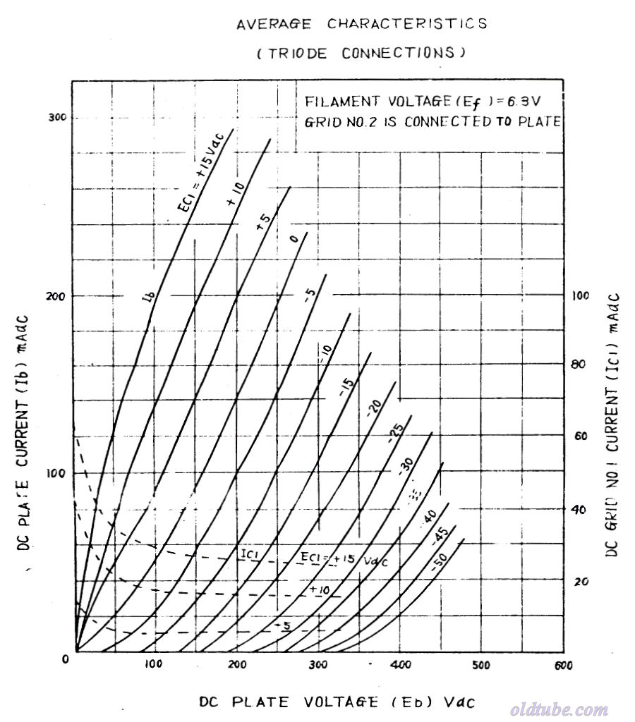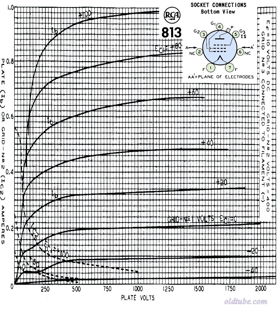 VT-62/8019/CV315/CV1062/CV1288/4304CB/'TB-1/60'=VHF PowerTriode= Ef/If=7.5V/3.2A Epmax=1250V Ipmax=100mA Ppmax=50W Fmax=100MHz (Epmax=750V Ipmax=100mA Ppmax=50W Fmax=300MHz) op : Ep=1000V Ip=50mA μ=10 gm=2mS rp=5kΩ 参考 : VT-62/CV1062/DET12のEpIp特性(plate current) 参考 : VT-62/CV1062/DET12のグリッド電流/EgIp特性(grid current) 参考 : VT-62/CV1062の外形図 outer-shape similar to WE-304B, 834, NEC TC-552-B 12) VT-62/8019 RCA/SLATER/United ¥17000 NIB MB == rare == RCA-#834同等(Plate,Gridがtop-pin) 但し、B4ソケットpinタイプ/England-4pin type