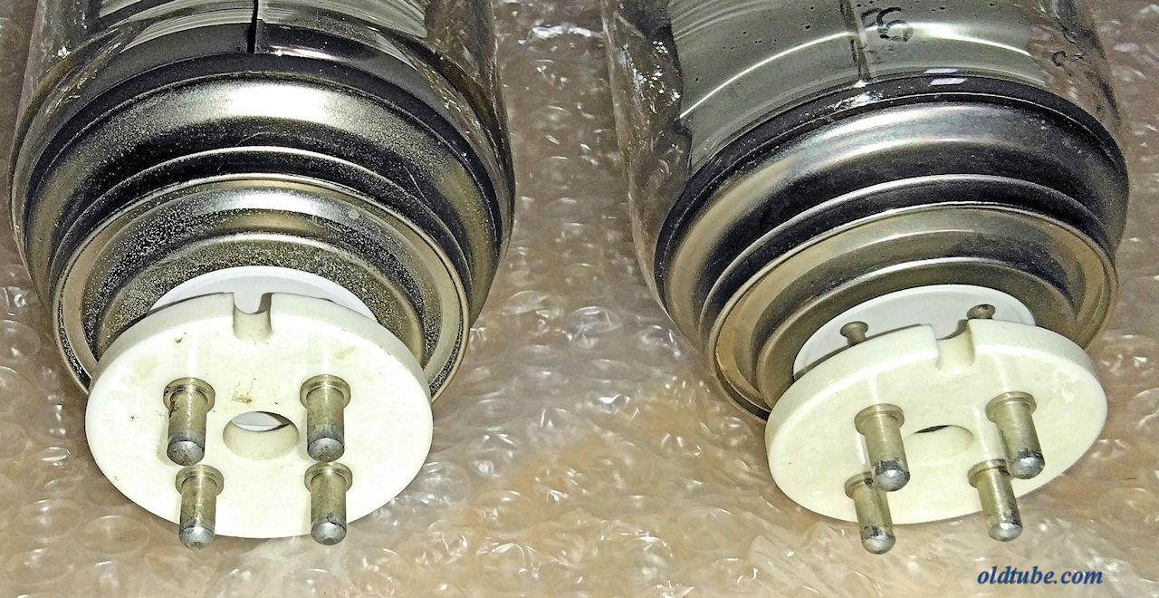 UXCV-11/CV-11 =Transmitting Triode= (CV11 = Jumbo 4-pin base, UXCV11 = UX 4-pin base) Ef/If=10V/2.5A Fmax=30MHz audio ratings : Ppmax=65W Epmax=1500V Ipmax=150mA (Icmax=25mA/6A(RF)) rp=3.5kΩ gm=4mS μ=14-typ op(audio B1pp) : Ep=1000V Ec=-70V Ip=30/240mA Zlpp=8kΩ Po=185W op(audio B1pp) : Ep=1250V Ec=-90V Ip=30/240mA Zlpp=11.2kΩ Po=200W op(audio B1pp) : Ep=1500V Ec=-70V Ip=30/225mA Zlpp=14.4kΩ Po=215W (参考 : Ep-Ip特性) similar types: RCA-830B(Ef/If=10V/2A, Ppmax=60W, μ=25), RCA-8005(Ef/If=10V/3.25A, Ppmax=75W, μ=20) 4) CV-11 United used ¥offer pill-type-getter =rare= 0) UXCV-11 United used ¥- pill-type-getter