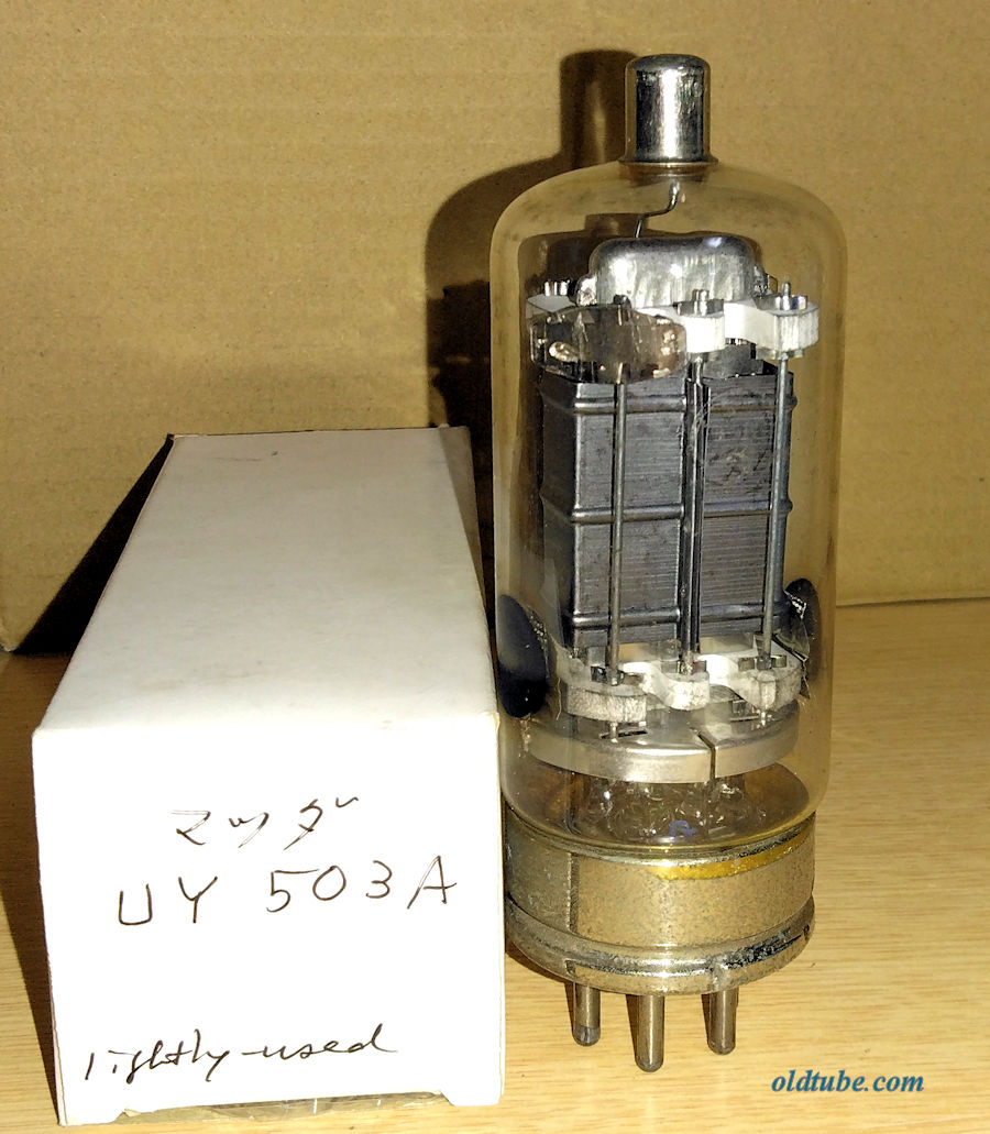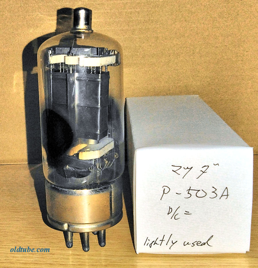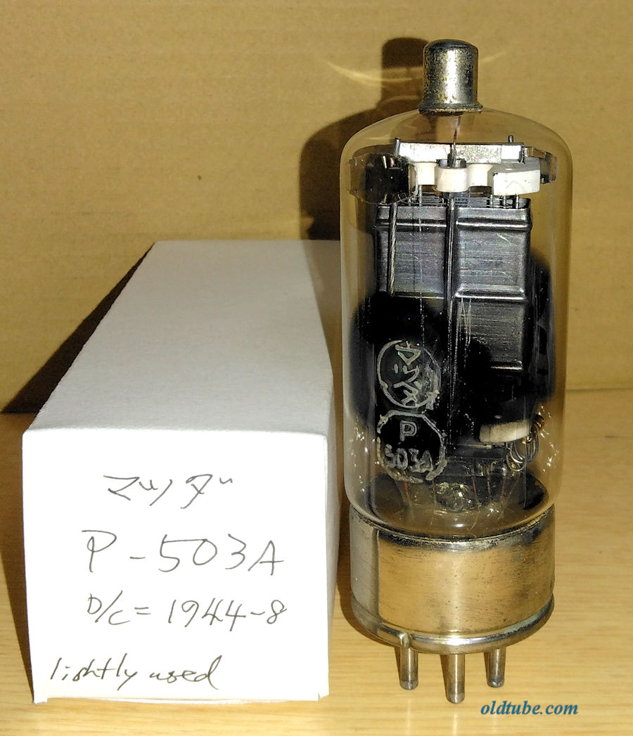 V503/V-503 =PowerTriode= Ef/If=4V/2.0A Ppmax=25W Epmax=450V op : Ep=100V Ec=0V rp=425Ω gm=10mS μ=4.25 op(AB1pp) : Ep=400V Ec=-85.0V Ip=50mAx2/105mAx2 gm=4.5mS Zl=3.7kΩ Po=32W op(AB1pp) : Ep=450V Ec=-96.5V Ip=55mAx2/115mAx2 gm=4.5mS Zl=4.0kΩ Po=40W (see Ep-Ip特性) similar to DA30(Osram), CV1178, NR56/DO30(Mullard), PX25A(Osram) 0) V503 Mazda ¥- used WB